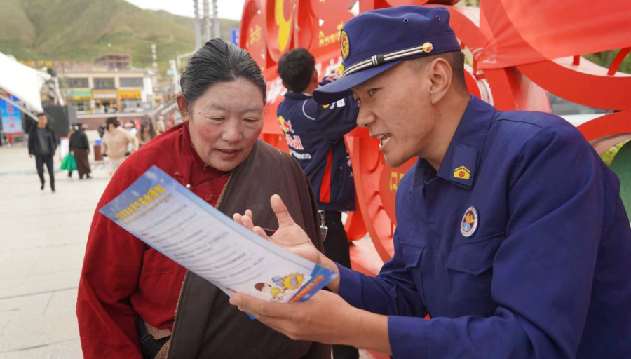 9月19日,在青海省玉树藏族自治州玉树市,消防宣传员用藏汉双语为群众科普安全知识。(青海省消防救援总队供图)