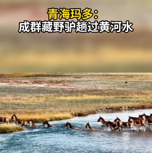 青海玛多:成群藏野驴趟过黄河水